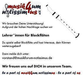 Der Blockflötenunterricht dient als Einstieg in die musikalische Ausbildung. Die Kinder spezialisieren sich erstmals auf ein Instrument. Mit der Blockflöte erlernen die Kinder die Notenschrift, erhalten ein erstes Rhythmusgefühl, üben die Motorik der Finger und lernen das Erzeugen eines Tones mit Hilfe ihrer Luft kennen.